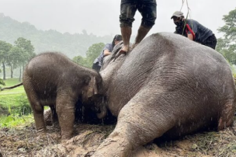 When the 10-year-old elephant mother and her 1-month-old calf were stuck in a concrete drain in central