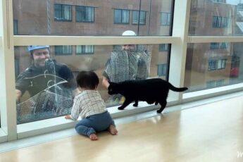 The little baby and a black cat were quietly sitting on the windowsill when all of a sudden ropes dangled