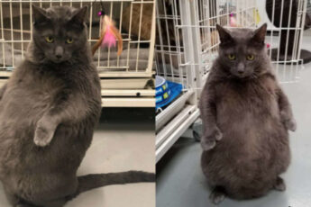 For the chubby shelter cat standing on his back legs seems comfy. The cat named Bruno was surrendered