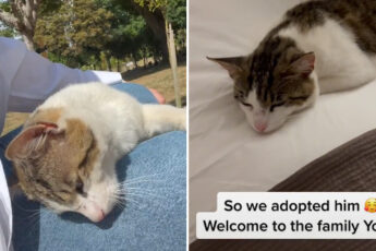 One kind man was feeding a cat and offering her to come indoors. But the cat didn’t want to come in.